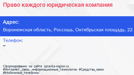 Право каждого, юридическая компания по адресу Воронежская область, Россошь, Октябрьская площадь, 22 в дальнейшем Организация, размещена в следующих категориях: