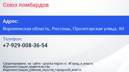 Союз ломбардов по адресу Воронежская область, Россошь, Пролетарская улица, 84 в дальнейшем Организация, размещена в следующих категориях: