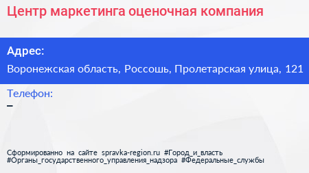 Центр маркетинга, оценочная компания по адресу Воронежская область, Россошь, Пролетарская улица, 121 в дальнейшем Организация, размещена в следующих категориях: