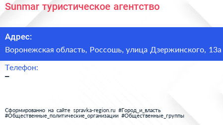 Sunmar, туристическое агентство по адресу Воронежская область, Россошь, улица Дзержинского, 13а в дальнейшем Организация, размещена в следующих категориях: