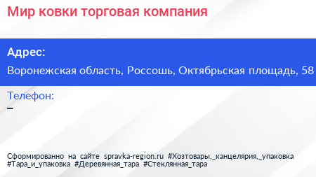 Мир ковки, торговая компания по адресу Воронежская область, Россошь, Октябрьская площадь, 58 в дальнейшем Организация, размещена в следующих категориях:
