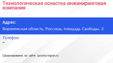 Технологическая оснастка, инжиниринговая компания по адресу Воронежская область, Россошь, площадь Свободы, 3 в дальнейшем Организация, размещена в следующих категориях: