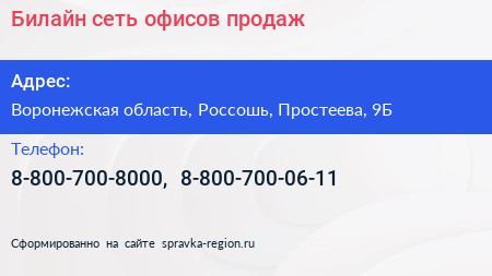 Билайн, сеть офисов продаж по адресу Воронежская область, Россошь, Простеева, 9Б в дальнейшем Организация, размещена в следующих категориях:
