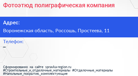 Фотоэтюд, полиграфическая компания по адресу Воронежская область, Россошь, Простеева, 11 в дальнейшем Организация, размещена в следующих категориях: