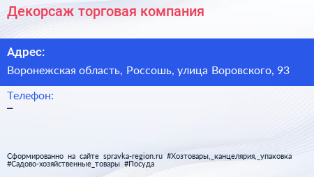 Декорсаж, торговая компания по адресу Воронежская область, Россошь, улица Воровского, 93 в дальнейшем Организация, размещена в следующих категориях: