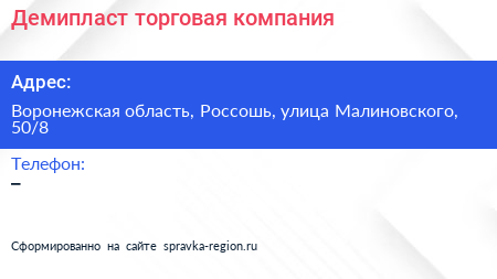 Демипласт, торговая компания по адресу Воронежская область, Россошь, улица Малиновского, 50/8 в дальнейшем Организация, размещена в следующих категориях: