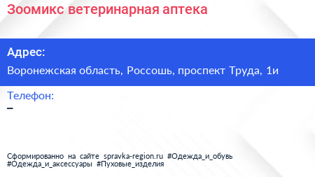 Зоомикс, ветеринарная аптека по адресу Воронежская область, Россошь, проспект Труда, 1и в дальнейшем Организация, размещена в следующих категориях: