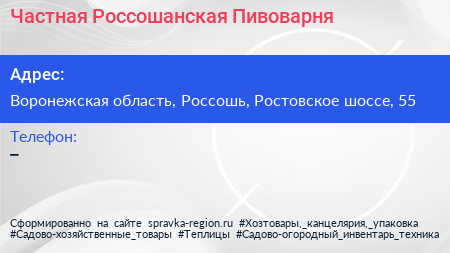 Частная Россошанская Пивоварня по адресу Воронежская область, Россошь, Ростовское шоссе, 55 в дальнейшем Организация, размещена в следующих категориях: