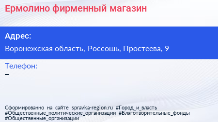 Ермолино, фирменный магазин по адресу Воронежская область, Россошь, Простеева, 9 в дальнейшем Организация, размещена в следующих категориях: