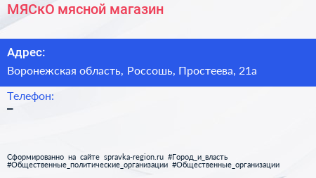 МЯСкО, мясной магазин по адресу Воронежская область, Россошь, Простеева, 21а в дальнейшем Организация, размещена в следующих категориях: