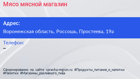 Мясо, мясной магазин по адресу Воронежская область, Россошь, Простеева, 19а в дальнейшем Организация, размещена в следующих категориях: