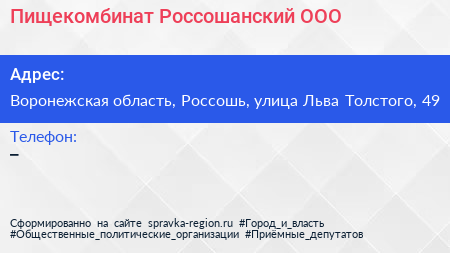 Пищекомбинат Россошанский, ООО по адресу Воронежская область, Россошь, улица Льва Толстого, 49 в дальнейшем Организация, размещена в следующих категориях: