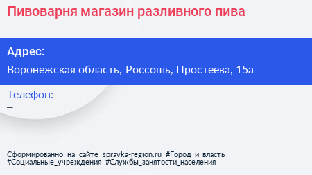 Пивоварня, магазин разливного пива по адресу Воронежская область, Россошь, Простеева, 15а в дальнейшем Организация, размещена в следующих категориях: