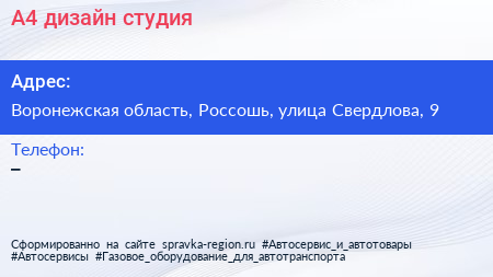 А4, дизайн-студия по адресу Воронежская область, Россошь, улица Свердлова, 9 в дальнейшем Организация, размещена в следующих категориях: