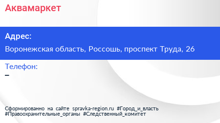 Аквамаркет по адресу Воронежская область, Россошь, проспект Труда, 26 в дальнейшем Организация, размещена в следующих категориях: