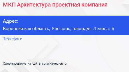 МКП Архитектура, проектная компания по адресу Воронежская область, Россошь, площадь Ленина, 6 в дальнейшем Организация, размещена в следующих категориях: