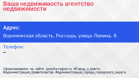 Ваша недвижимость, агентство недвижимости по адресу Воронежская область, Россошь, улица Ленина, 8 в дальнейшем Организация, размещена в следующих категориях: