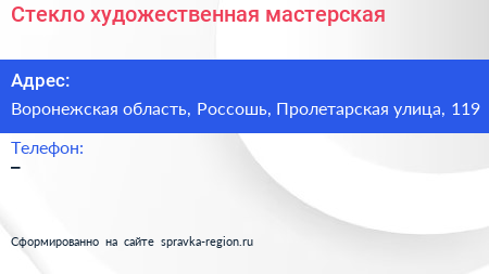 Стекло, художественная мастерская по адресу Воронежская область, Россошь, Пролетарская улица, 119 в дальнейшем Организация, размещена в следующих категориях: