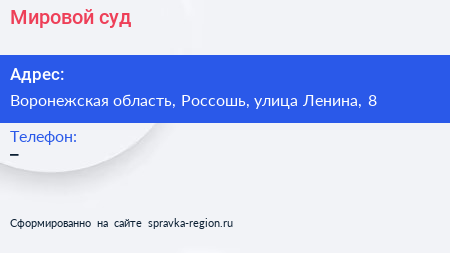 Мировой суд по адресу Воронежская область, Россошь, улица Ленина, 8 в дальнейшем Организация, размещена в следующих категориях: