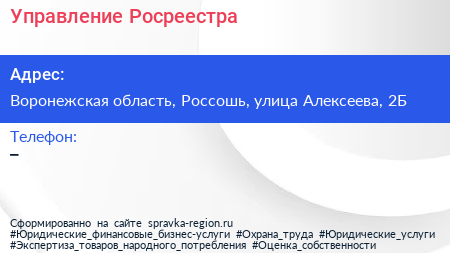 Управление Росреестра по адресу Воронежская область, Россошь, улица Алексеева, 2Б в дальнейшем Организация, размещена в следующих категориях: