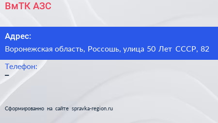 ВмТК, АЗС по адресу Воронежская область, Россошь, улица 50 Лет СССР, 82 в дальнейшем Организация, размещена в следующих категориях:
