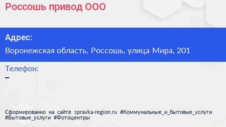 Россошь-привод, ООО по адресу Воронежская область, Россошь, улица Мира, 201 в дальнейшем Организация, размещена в следующих категориях: