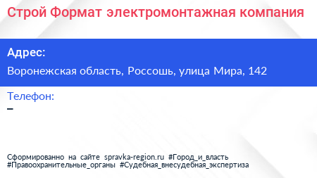 Строй-Формат, электромонтажная компания по адресу Воронежская область, Россошь, улица Мира, 142 в дальнейшем Организация, размещена в следующих категориях: