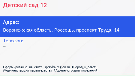 Детский сад №12 по адресу Воронежская область, Россошь, проспект Труда, 14 в дальнейшем Организация, размещена в следующих категориях: