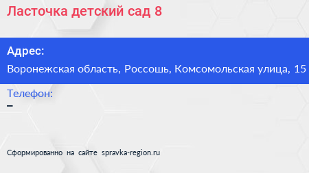 Ласточка, детский сад №8 по адресу Воронежская область, Россошь, Комсомольская улица, 15 в дальнейшем Организация, размещена в следующих категориях: