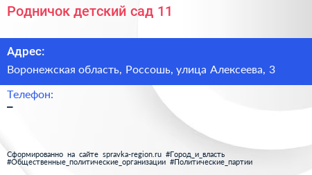 Родничок, детский сад №11 по адресу Воронежская область, Россошь, улица Алексеева, 3 в дальнейшем Организация, размещена в следующих категориях: