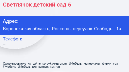 Светлячок, детский сад №6 по адресу Воронежская область, Россошь, переулок Свободы, 1а в дальнейшем Организация, размещена в следующих категориях: