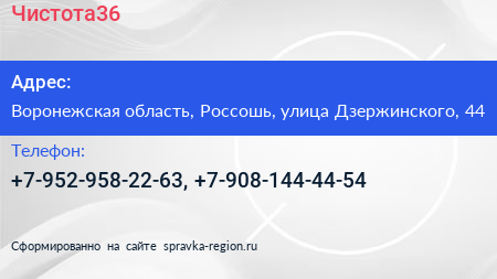 Чистота36 по адресу Воронежская область, Россошь, улица Дзержинского, 44 в дальнейшем Организация, размещена в следующих категориях: