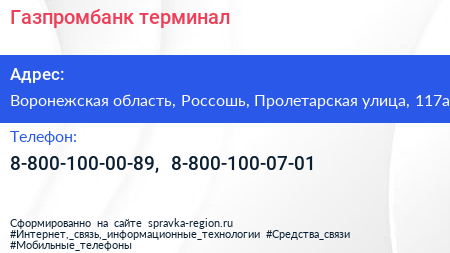 Газпромбанк, терминал по адресу Воронежская область, Россошь, Пролетарская улица, 117а в дальнейшем Организация, размещена в следующих категориях: