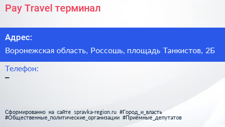 Pay.Travel, терминал по адресу Воронежская область, Россошь, площадь Танкистов, 2Б в дальнейшем Организация, размещена в следующих категориях: