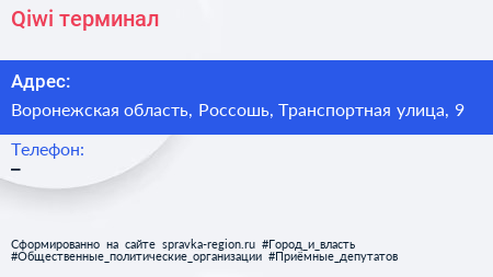 Qiwi, терминал по адресу Воронежская область, Россошь, Транспортная улица, 9 в дальнейшем Организация, размещена в следующих категориях: