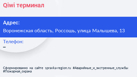 Qiwi, терминал по адресу Воронежская область, Россошь, улица Малышева, 13 в дальнейшем Организация, размещена в следующих категориях: