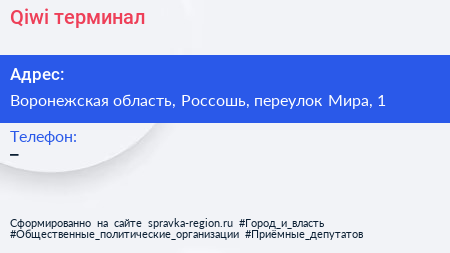 Qiwi, терминал по адресу Воронежская область, Россошь, переулок Мира, 1 в дальнейшем Организация, размещена в следующих категориях:
