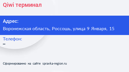Qiwi, терминал по адресу Воронежская область, Россошь, улица 9 Января, 15 в дальнейшем Организация, размещена в следующих категориях: