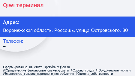 Qiwi, терминал по адресу Воронежская область, Россошь, улица Островского, 80 в дальнейшем Организация, размещена в следующих категориях: