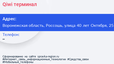 Qiwi, терминал по адресу Воронежская область, Россошь, улица 40 лет Октября, 25 в дальнейшем Организация, размещена в следующих категориях: