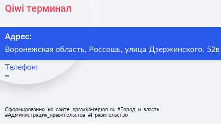 Qiwi, терминал по адресу Воронежская область, Россошь, улица Дзержинского, 52в в дальнейшем Организация, размещена в следующих категориях: