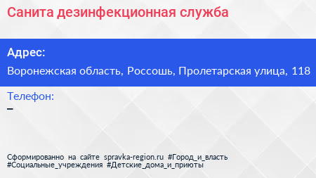 Санита, дезинфекционная служба по адресу Воронежская область, Россошь, Пролетарская улица, 118 в дальнейшем Организация, размещена в следующих категориях: