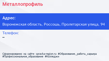 Металлопрофиль по адресу Воронежская область, Россошь, Пролетарская улица, 94 в дальнейшем Организация, размещена в следующих категориях: