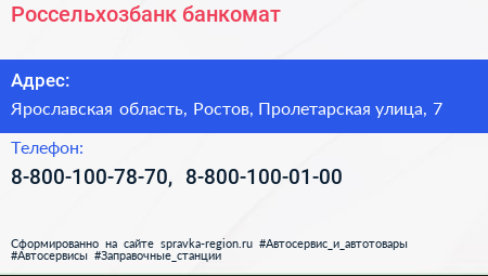 Россельхозбанк, банкомат по адресу Ярославская область, Ростов, Пролетарская улица, 7 в дальнейшем Организация, размещена в следующих категориях: