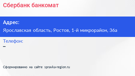 Сбербанк, банкомат по адресу Ярославская область, Ростов, 1-й микрорайон, 36а в дальнейшем Организация, размещена в следующих категориях:
