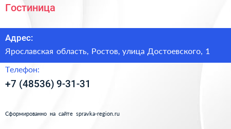 Гостиница по адресу Ярославская область, Ростов, улица Достоевского, 1 в дальнейшем Организация, размещена в следующих категориях: