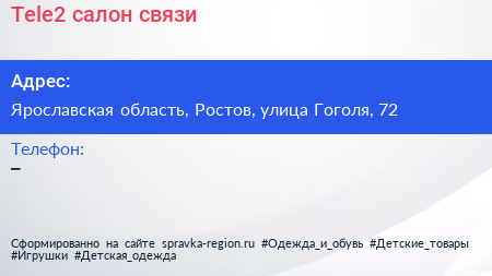 Tele2, салон связи по адресу Ярославская область, Ростов, улица Гоголя, 72 в дальнейшем Организация, размещена в следующих категориях: