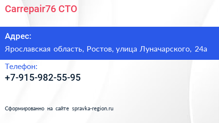 Carrepair76, СТО по адресу Ярославская область, Ростов, улица Луначарского, 24а в дальнейшем Организация, размещена в следующих категориях: