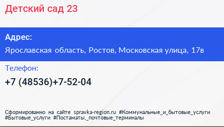 Детский сад №23 по адресу Ярославская область, Ростов, Московская улица, 17в в дальнейшем Организация, размещена в следующих категориях: