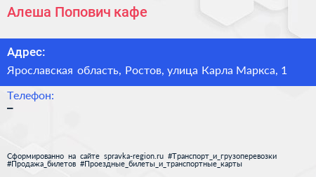 Алеша Попович, кафе по адресу Ярославская область, Ростов, улица Карла Маркса, 1 в дальнейшем Организация, размещена в следующих категориях: